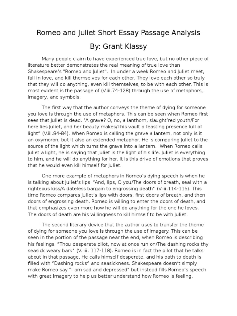 · In the story, Juliet was a timid child while Romeo was suffering from depression. After their meeting and falling in love their personalities changed for the better. Romeo became a passionate and loving person while Juliet turned into a strong confident woman. This shows how powerful love is. In the end, Romeo hears that his beloved lover died Here’s a PEEL paragraph exploring how Romeo ‘s character is presented in the first scene: Romeo’s state of mind before he encounters Juliet, is revealingly explored in his declaration to Benvolio that, ‘This is not Romeo/he’s some other else.’. Here, Romeo’s state of mind is shown through his evident frustration about his unrequited passion for Romeo and Juliet Analytical Paragraph. Juliet has proven to be more mature compared to Romeo because of her practical attitude and better control over her emotions. In Act 2, scene 1, both Romeo and Juliet profess their love for each other outside of the Capulet’s house but Juliet is more realistic about their love and more cautious when she Estimated Reading Time: 3 mins